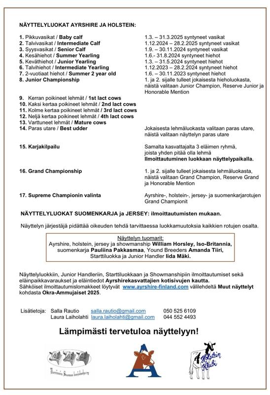 Näyttelykutsu julkaistaan pian! Lisätiedot: Varsinais-Suomen Karjakerho Ry: Leena Lähteemäki 050 572 9831 Suomen Ayrshirekasvattatat Ry: Laura Laiholahti 044 552 4493 Suomen Holstein Klubi Ry: Jani Oivaranta 050 913 0129