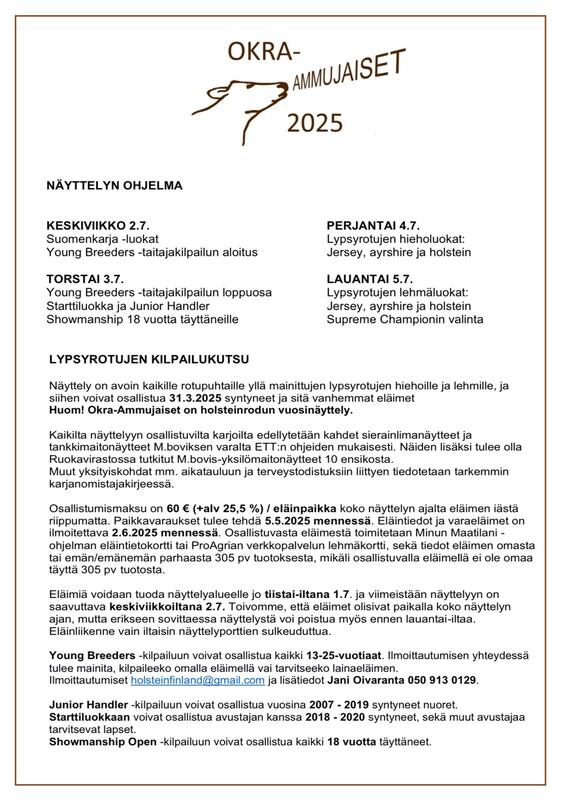 Ilmoittautumislomakkeet näyttelyyn löydät täältä! Suomen Ayrshirekasvattajat ry järjestävät Okra -maatalousnäyttelyn yhteydessä lypsykarjanäyttelyn yhteistyössä Varsinais-Suomen Karjakerho ryn ja Suomen Holstein Klubi ry:n kanssa. Näyttelyn ohjelma: 2.7. Keskiviikko Suomenkarja-luokat Young Breeders -taitajakilpailun aloitus 3.7. Torstai Young Breeders -taitajakilpailun loppuosa Junior Handler -luokat Showmanship -kilpailu 4.7. Perjantai Lypsyrotujen hieholuokat (Jersey, Ayrshire, Holstein) 5.7. Lauantai Lypsyrotujen lehmäluokat (Jersey, Ayrshire, Holstein)